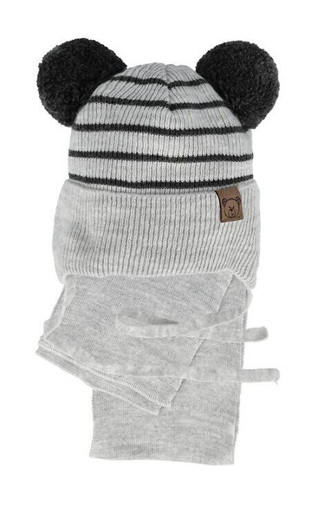 Czapka wiązana pod szyją, do kompletu szalik. Od wewnątrz podszyta bawełną. Model z dwoma pomponami i z wywijanym otokiem. Idealny na chłodne dni