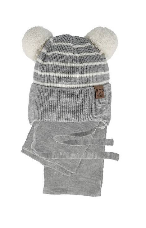 Czapka wiązana pod szyją, do kompletu szalik. Od wewnątrz podszyta bawełną. Model z dwoma pomponami i z wywijanym otokiem. Idealny na chłodne dni