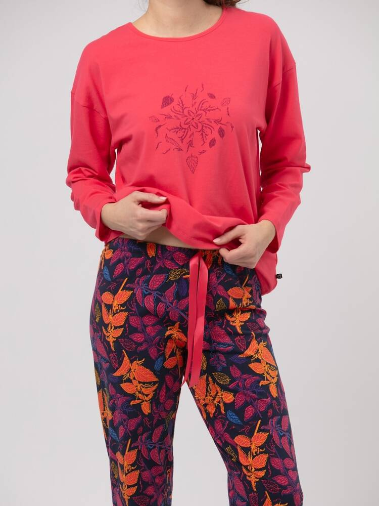 Piżama damska - koszulka z długim rękawem ozdobiona delikatnym nadrukiem. Dekolt półokrągły. Spodnie długie wzorzyste . W pasie gumka obszyta bawełną.