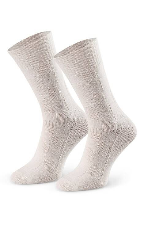 Ciepłe skarpety damskie z wysokiej jakość wełny. Ozdobione delikatnym geometrycznym wzorem zapewniają ciepło i komfort użytkowania. Posiadają delikatny ściągacz.