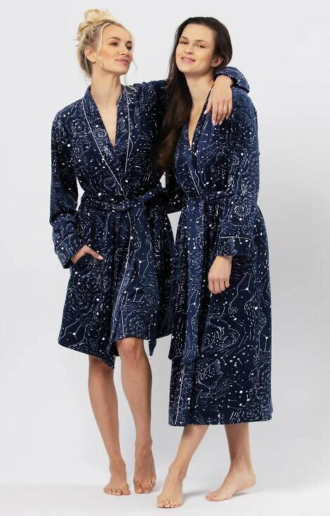 Krótki szlafrok damski wykonany z miękkiej dzianiny o wzorze rozgwieżdżonego nieba.