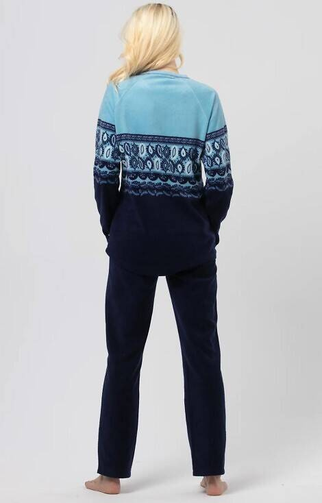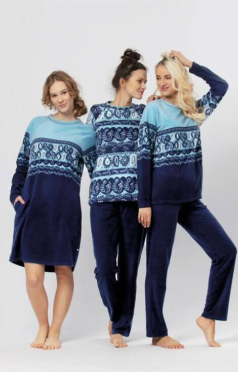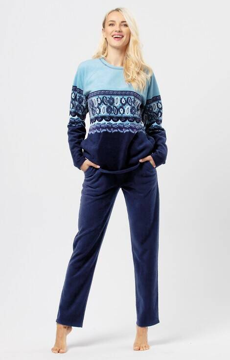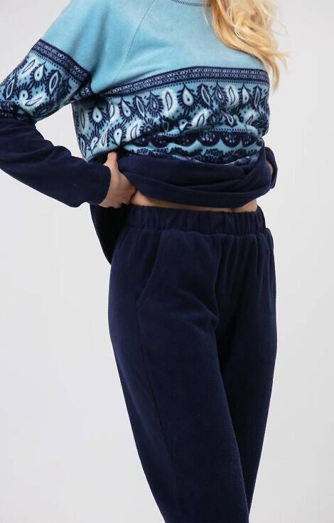 Ciepła , zimowa piżama wykonana z micropolaru. Bluza z długim rękawem wzorzysta. Gładkie, długie spodnie. W pasie miękka guma i kieszenie.