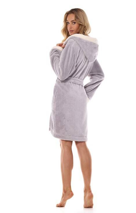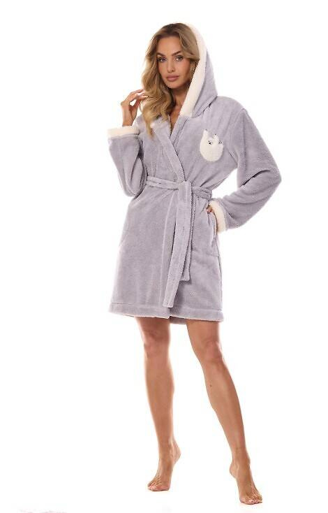 kraj produkcji: POLSKASzlafrok damski z kapturem z dzianiny typu soft. Na piersi puchata aplikacja.