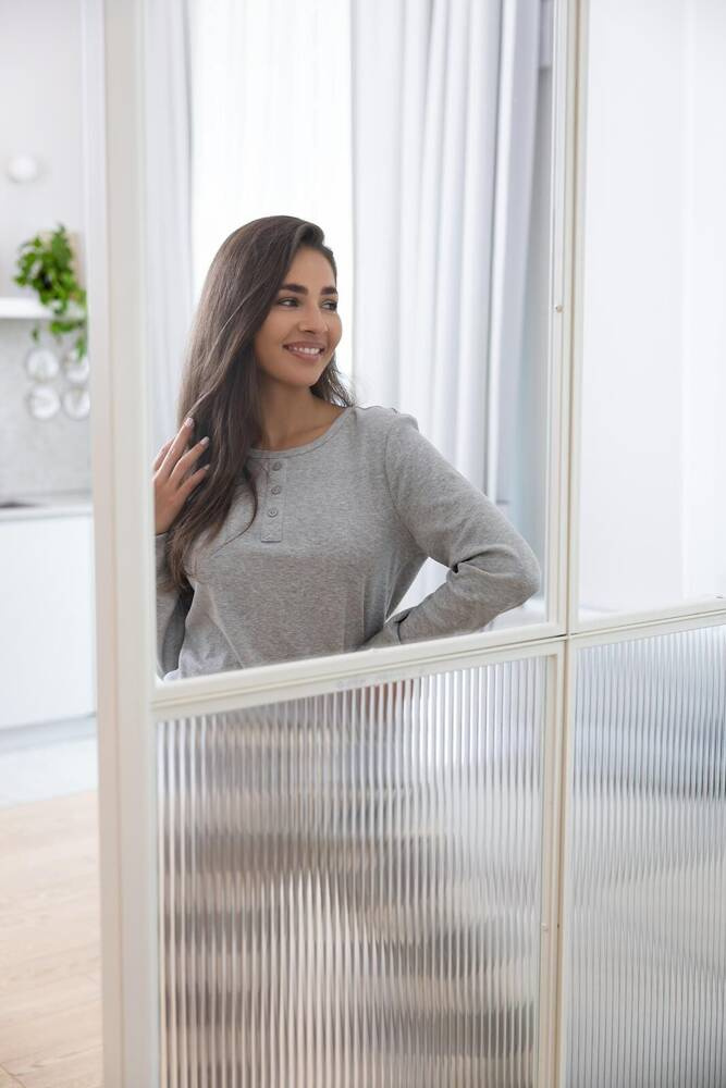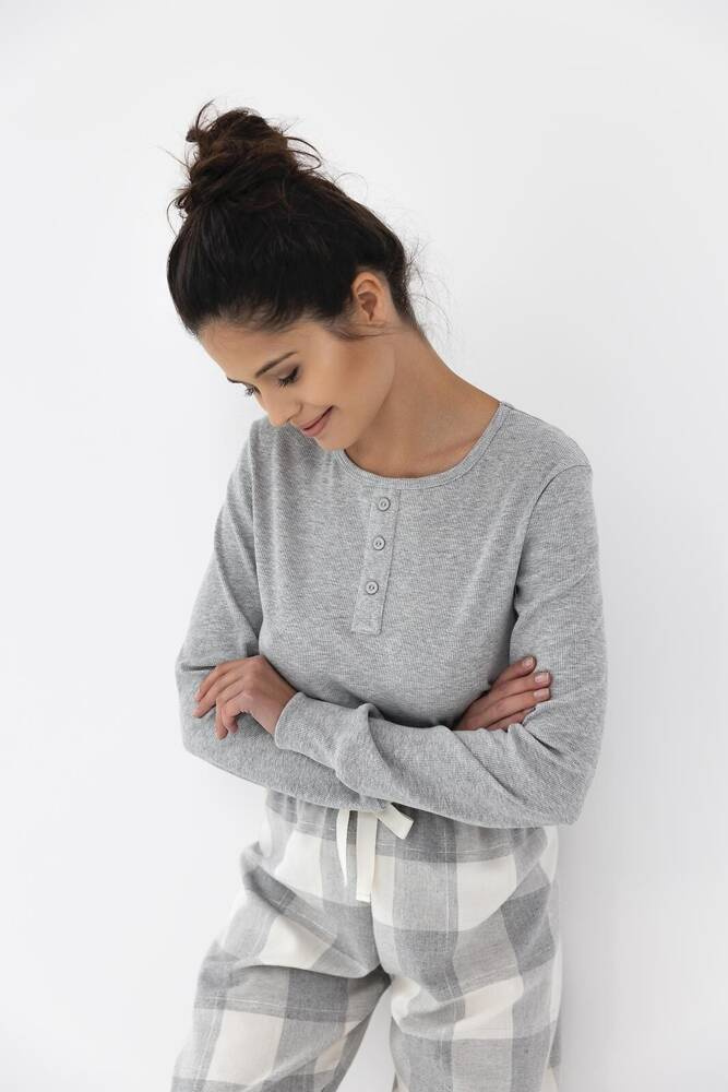 Piżama damska wykonana z wysokiej jakości bawełny. Koszulka z długim rękawem, dekolt ozdobiony guzikami.