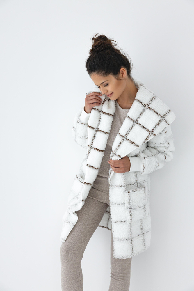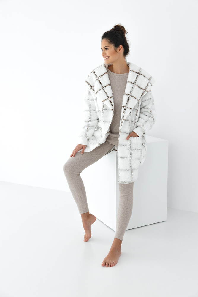 Wygodny, szlafrok damski. Wykonany z miękkiej, puszystej dzianiny typu soft. Model do połowy uda, o prostym kroju z długim rękawem. Na wysokości bioder posiada dwie kieszonki. Bardzo wygodny fason, delikatnie dopasowany do ciała. Spodoba się kobietom, które uwielbiają delikatność i swobodę.