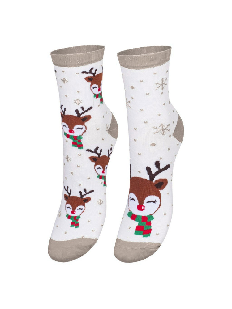 1283-015 Renifer W Szaliku Świąteczne Skarpety damskie Milena -ecru beżowy