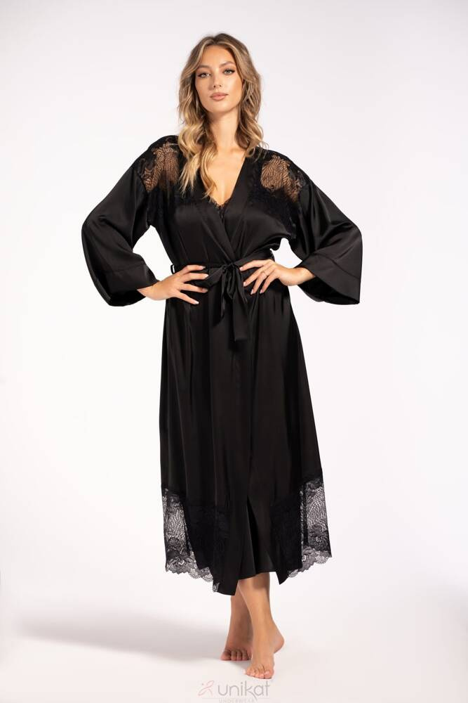 Długi szlafrok Oriana, podkreśla atuty kobiecego ciała. Wykonany został z przyjemnej dla ciała satyny. Wiązany jest w pasie. Stanowi kwintesencję kobiecości w niezwykle modnym i efektownym wydaniu.