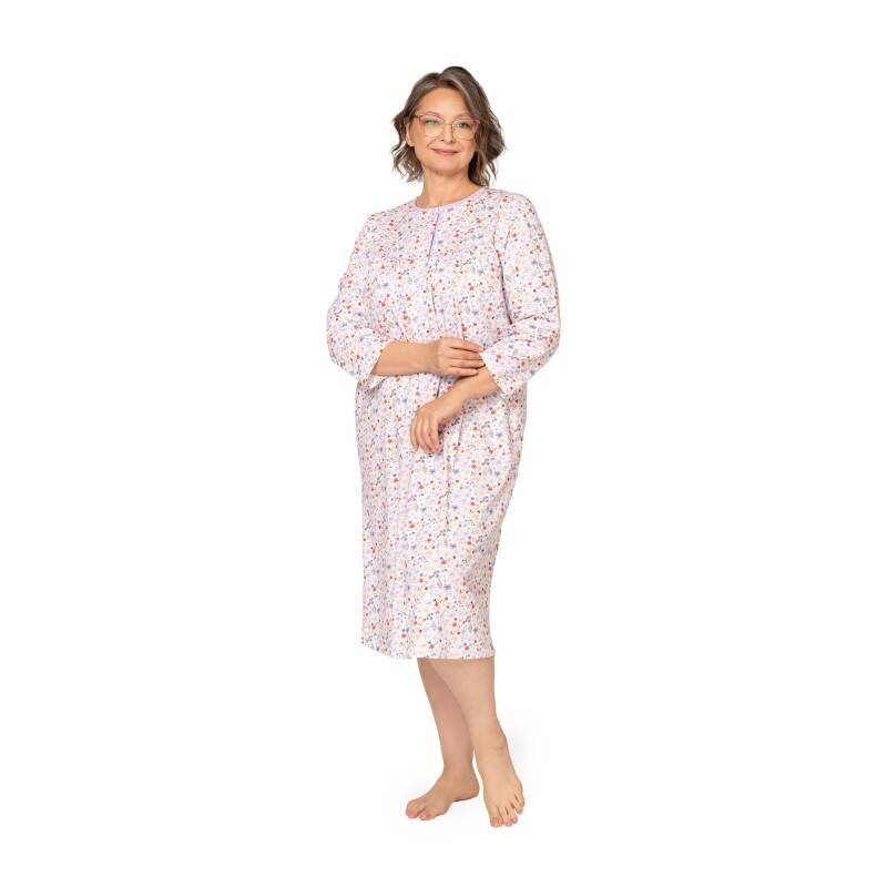 Damska rozpinana koszula nocna z rękawem 3/4 to doskonała propozycja zarówno na lato, jak i na chłodniejsze noce. Przyjemna dla skóry 100% bawełna zapewni odpowiedni komfort termiczny, a delikatny, kwiatowy motyw przypadnie do gustu każdej kobiecie. Damska koszula nocna jest rozpinana na dekolcie, dzięki czemu idealnie nadaje się dla kobiet karmiących. Ta bawełniana damska koszula do spania to gwarancja wygody i swobody każdej nocy. Damska koszula nocna dostępna jest w rozmiarach od M do XXXL