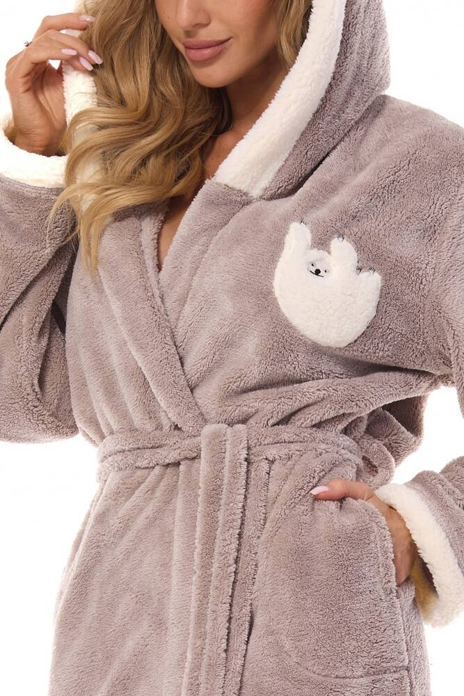 kraj produkcji: POLSKASzlafrok damski z kapturem z dzianiny typu soft. Na piersi puchata aplikacja.