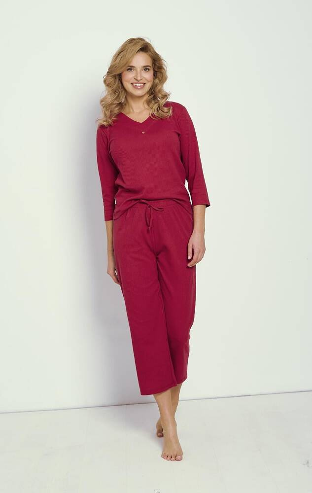 Piżama damska uszyta z wysokiej jakości bawełny. Koszulka z rękawem 3/4, dekolt typu V. Do kompletu spodnie 3/4. Pas ozdobiony wiązaniem z troczkiem.