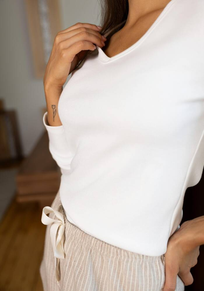 Piżama damska wykonana z wysokiej jakości bawełny. Koszulka z długim rękawem, dekolt typu V.