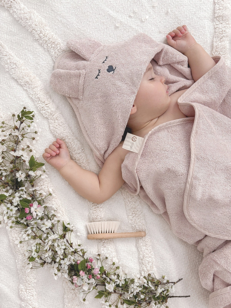 Ręcznik posiada uroczy i bardzo praktyczny kapturek z eleganckim haftem, który nie pozwoli wychłodzić się maluchowi po kąpieli i delikatnie osuszy jego włoski.
