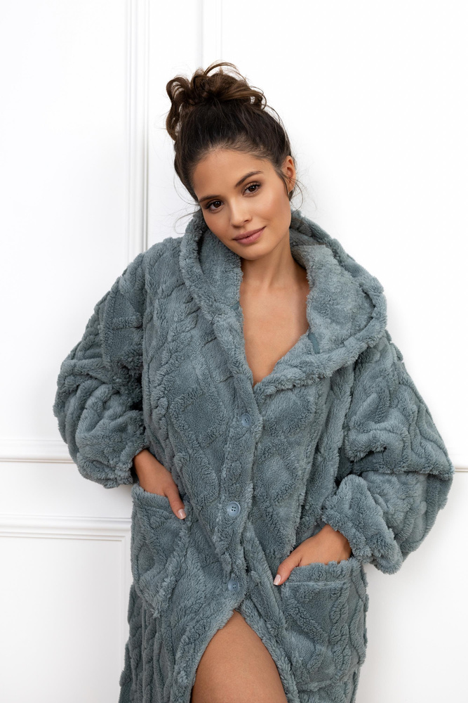 Szlafrok damski wykonany z miłej i miękkiej dzianiny typu soft. Model z długim rękawem i kapturem. Na wysokości bioder funkcjonalne kieszenie. Zapinany na guziki.
