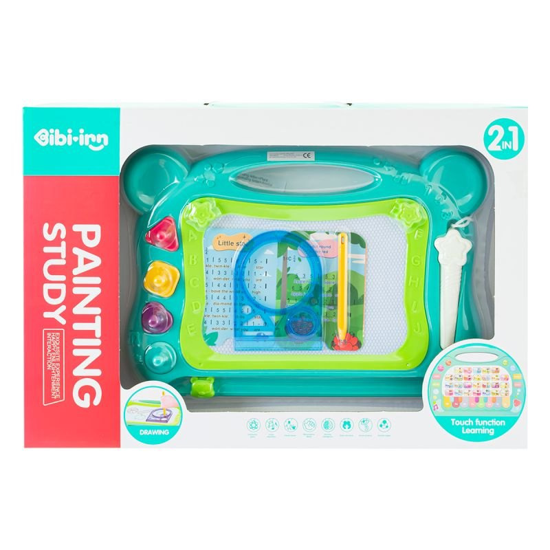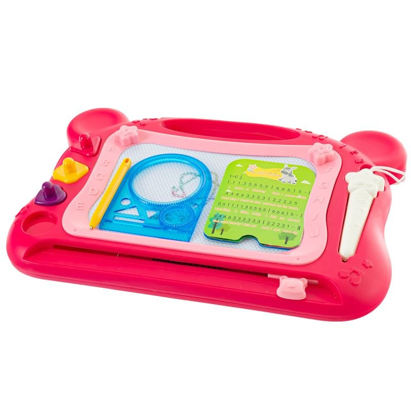 Dwustronna tablica do rysowania z multimedialnym panelem. Umożliwi rozwój oraz naukę. Literki z podziałem na rośliny oraz zwierzęta pomogą w nauce czytania, oraz rozpoznawania różnych elementów. Melodie oraz muzyka wspomogą rozwój słuchowy. Quiz umożliwi im naukę poprzez zabawę. Pianinko da dziecku możliwość nowej frajdy. Możliwość regulacji głośności.