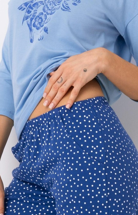 Piżama damska z wzorzystej bawełny.  Koszulka z okrągłym dekoltem,  rękaw 3/4. W komplecie spodnie 7/8 w kropki.