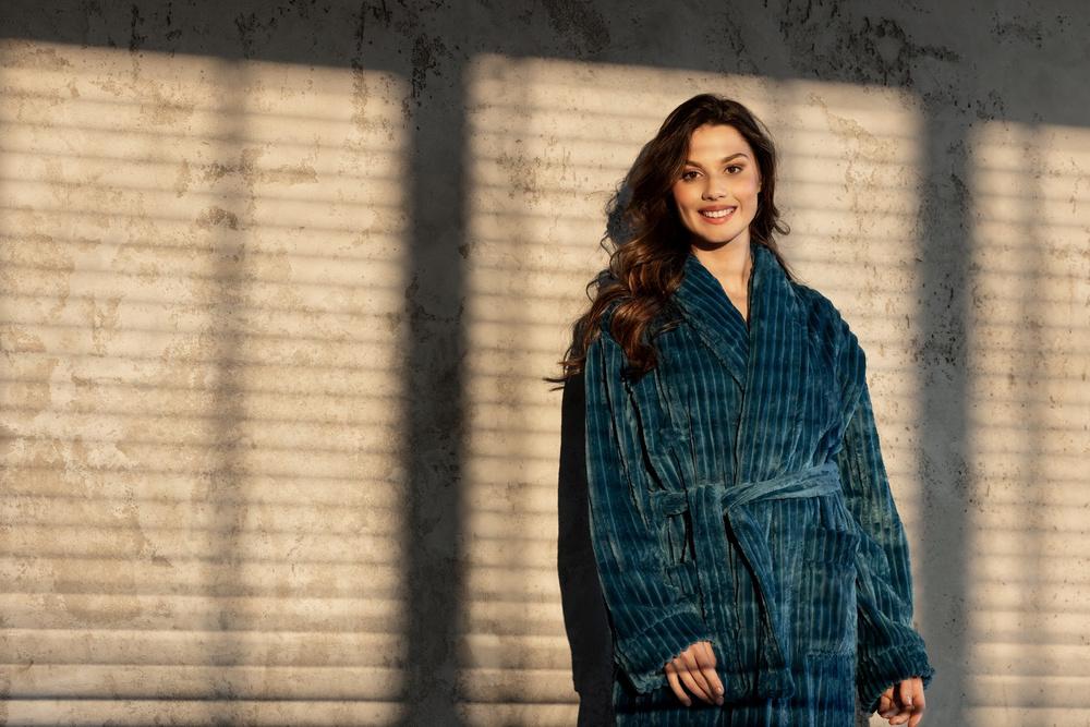 Ekskluzywny szlafrok wiązany w pasie. Główną zaletą tego modelu jest cieplutka i miła w dotyku pluszowa tkanina.