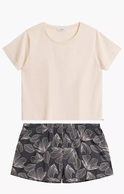 Piżama damska wykonana z miękkiej, przyjemnej w dotyku dzianiny. Koszulka z krótkim rękawem . W komplecie krótkie spodenki o luźnym kroju z kieszeniami. W pasie gumka.