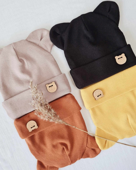 Efektowna czapeczka z uszkami. Doskonale nadaje się jako czapeczka na przyjemne, jesienne dni. Wykonany z miękkiej i przyjemnej bawełny, która doskonale rozciąga się i dostosowuje się do główki dziecka.