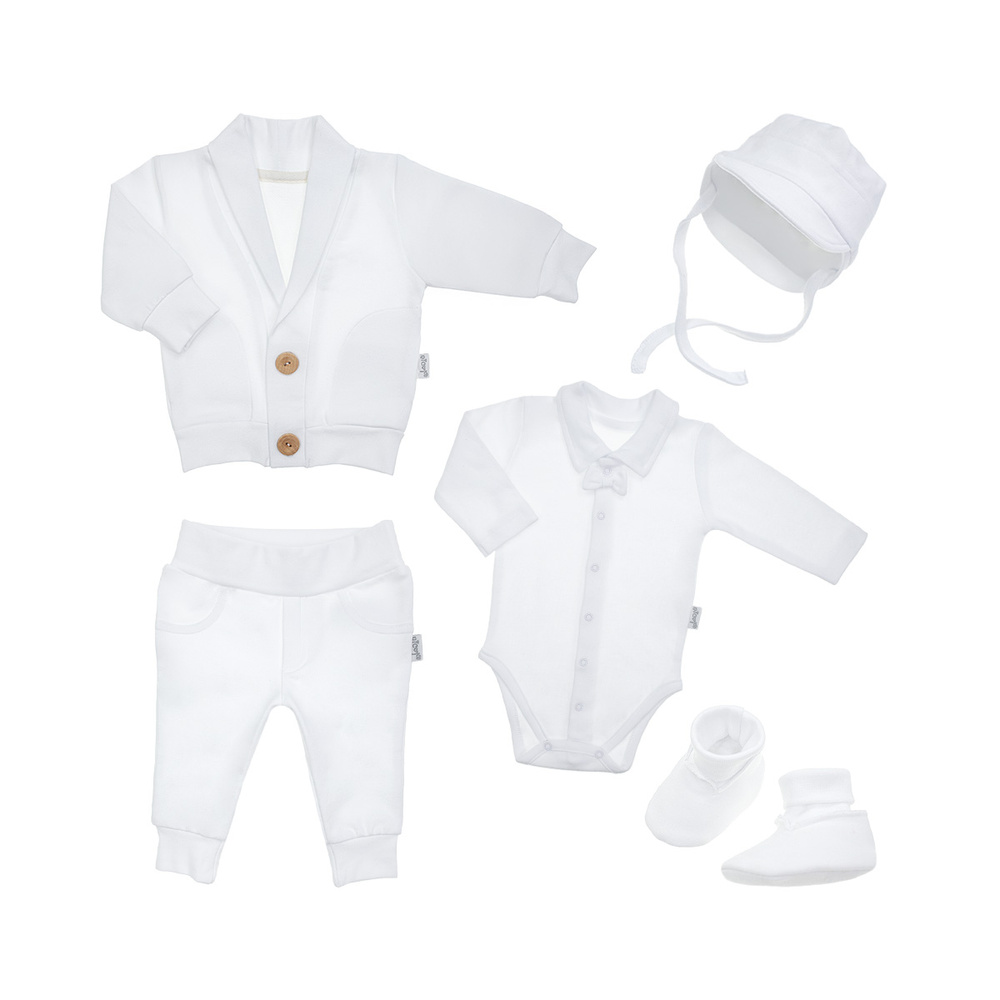Komplet niemowlęcy, który składa się z spodni, bluzy, czapeczki, body i bucików. Zapakowany w pudełko. Całość uszyta z 100% bawełny.