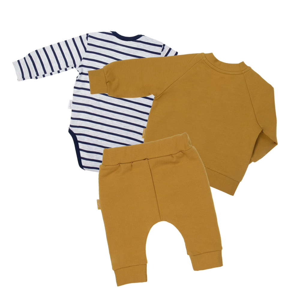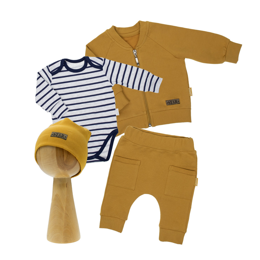 Zestaw wyprawkowy, który składa się z body, bluzy, spodni i czapki. Ubranka z wysokogatunkowej bawełny.
