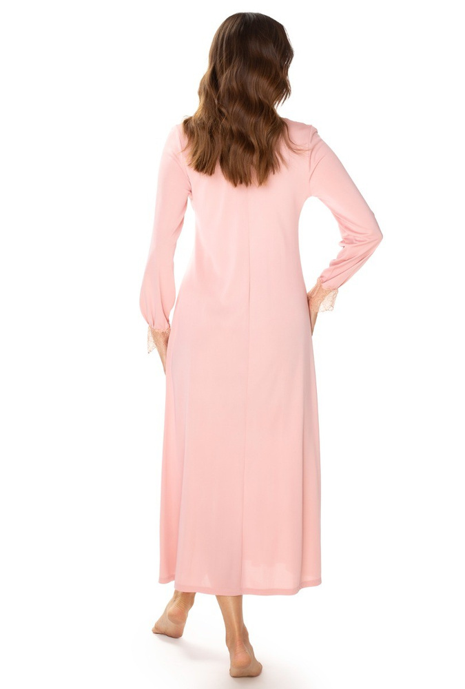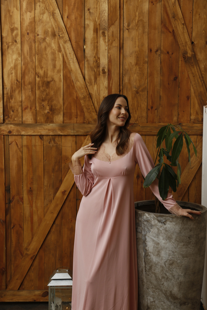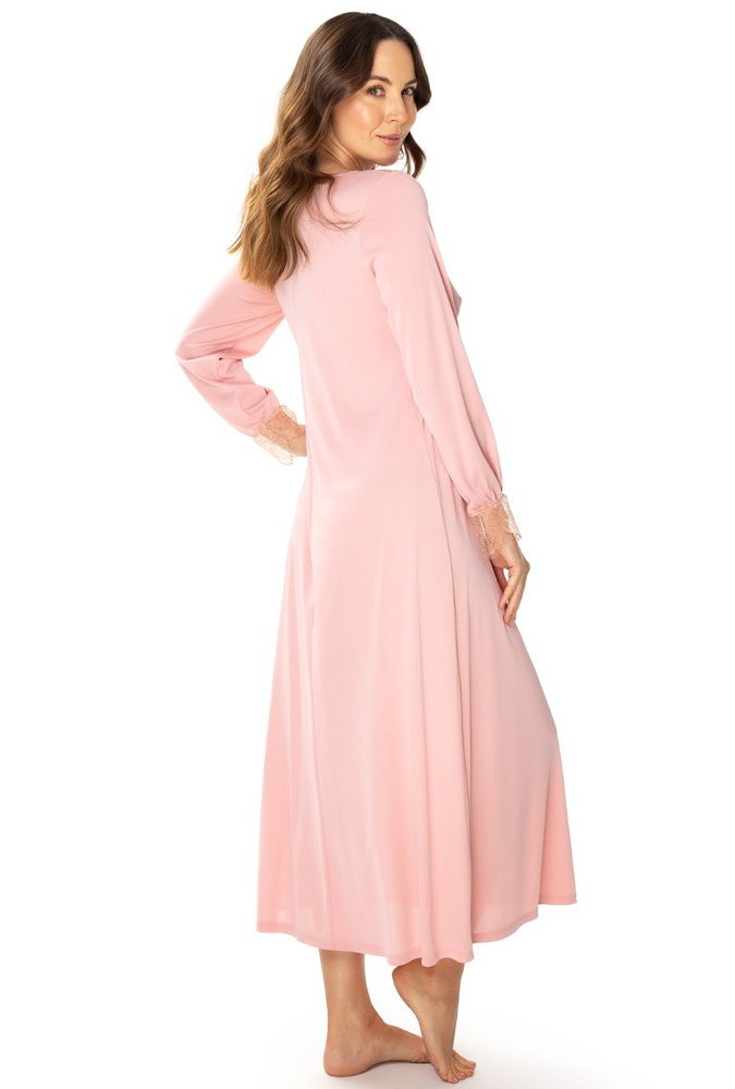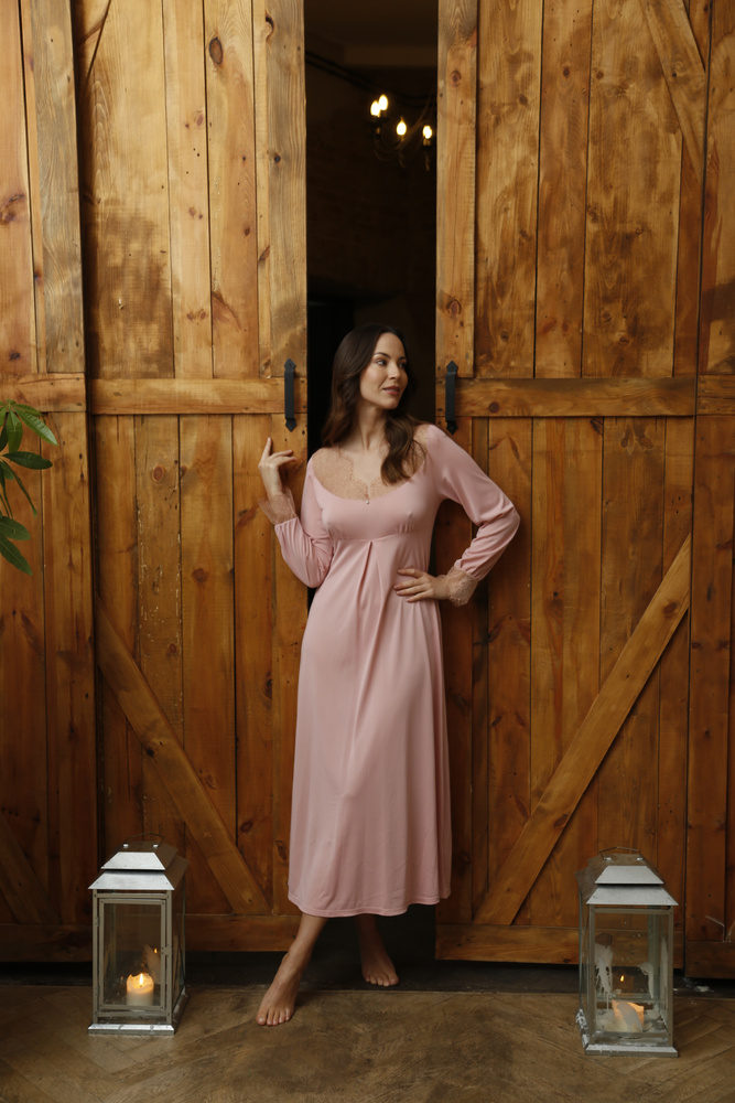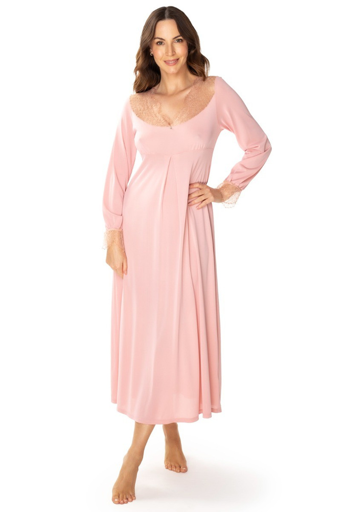 Koszula stworzona z myślą o kobietach ceniących elegancję, wygodę i klasyczne fasony. Wykonana z delikatnej, oddychającej dzianiny VISTEX®. Doskonale otula ciało, zapewniając komfort noszenia przez całą noc. Model odcinany pod biustem subtelnie podkreśla sylwetkę i maskuje ewentualne niedoskonałości, a długość maxi oraz długi rękaw czynią ją idealnym wyborem na chłodniejsze dni. Zmysłowe koronkowe detale na dekolcie i rękawach dodają romantycznego charakteru