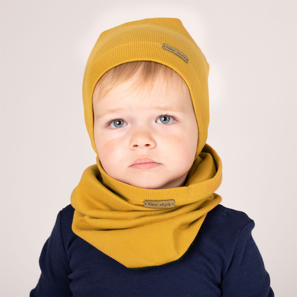 Czapka i komin doskonale nadaje się jako komplet na przyjemne, wiosenne dni. Wykonany z miękkiej i przyjemnej bawełny, która doskonale rozciąga się i dostosowuje się do główki dziecka.