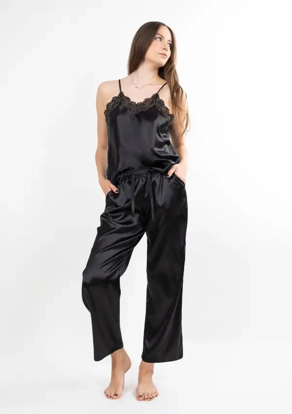 Tila piżama satynowa czarna Dkaren - top i długie spodnie damska bielizna nocna