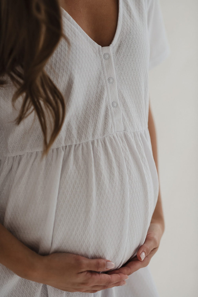 Minimalistyczny design, romantyczne detale i naturalna tkanina sprawiają, że koszula Aurora to nie tylko funkcjonalna odzież ciążowa, ale też piękny element garderoby domowej.