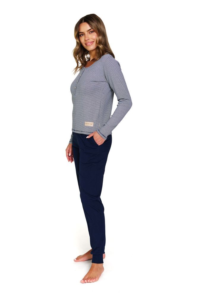 Piżama damska Doctor Nap 7352 to wygodny komplet na każdą porę roku, łączący klasykę i nowoczesny styl. Bluzka z długim rękawem, subtelnym rozpinaniem i ozdobnym guziczkami świetnie komponuje się z prostymi spodniami wykończonymi ściągaczami. Wykonana z miękkiej, przyjaznej dla skóry bawełny, zapewnia komfort snu i codziennego noszenia. Polska produkcja to gwarancja staranności i wysokiej jakości.