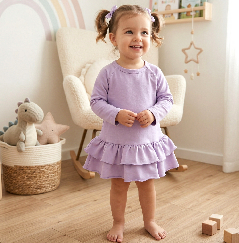 Fioletowa sukienka niemowlęca Underwater World od Nini z długim rękawem to elegancka i wygodna propozycja dla najmłodszych. Uszyta ze 100% bawełny organicznej, jest miękka, przyjazna dla wrażliwej skóry dziecka i pozwala skórze oddychać. Luźny krój z uroczą falbanką zapewnia komfort noszenia i swobodę ruchów. Prosta, jednokolorowa forma sprawia, że sukienka idealnie nadaje się zarówno na co dzień, jak i na wyjątkowe okazje.