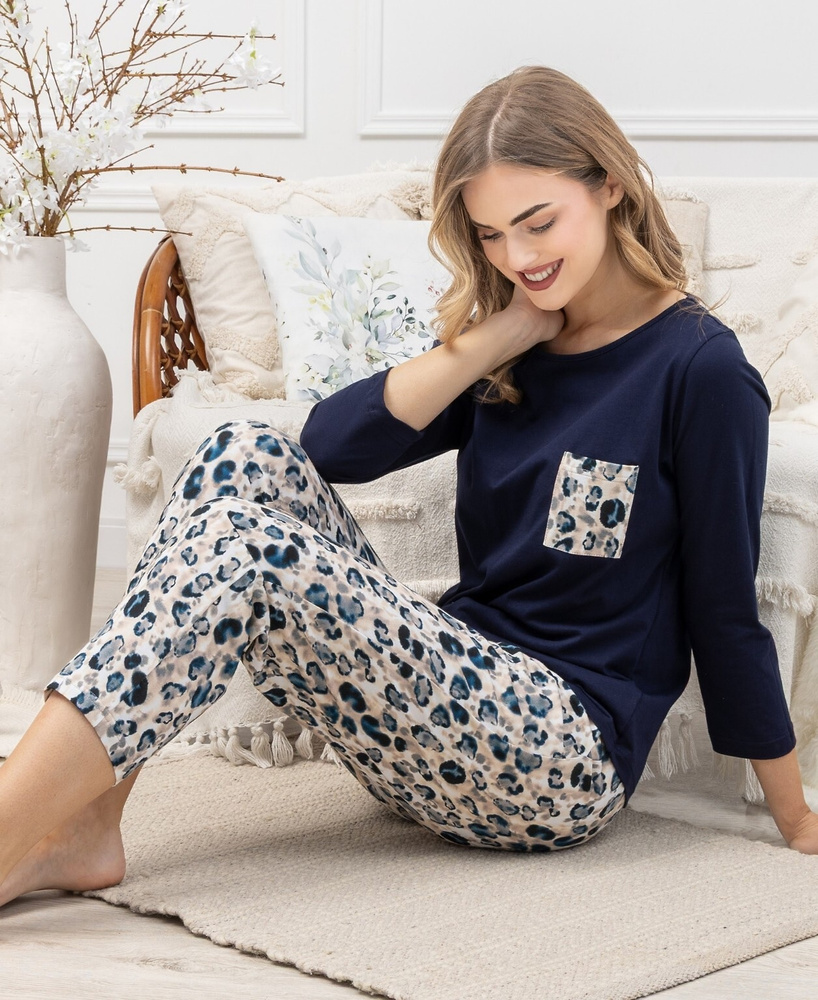 Bluzka z długim rękawem oraz klasyczne, pełne spodnie tworzą spójny komplet, który nie krępuje ruchów i pozwala na pełen relaks. Głęboki granatowy kolor nadaje piżamie eleganckiego i ponadczasowego charakteru.