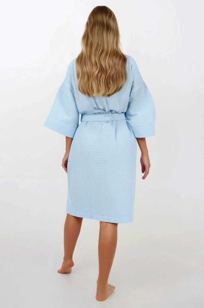 - Stylowy szlafrok Blue Lady z rękawem 3/4, wiązany w pasie. Naturalna bawełna i polska produkcja – komfort i elegancja w jednym.