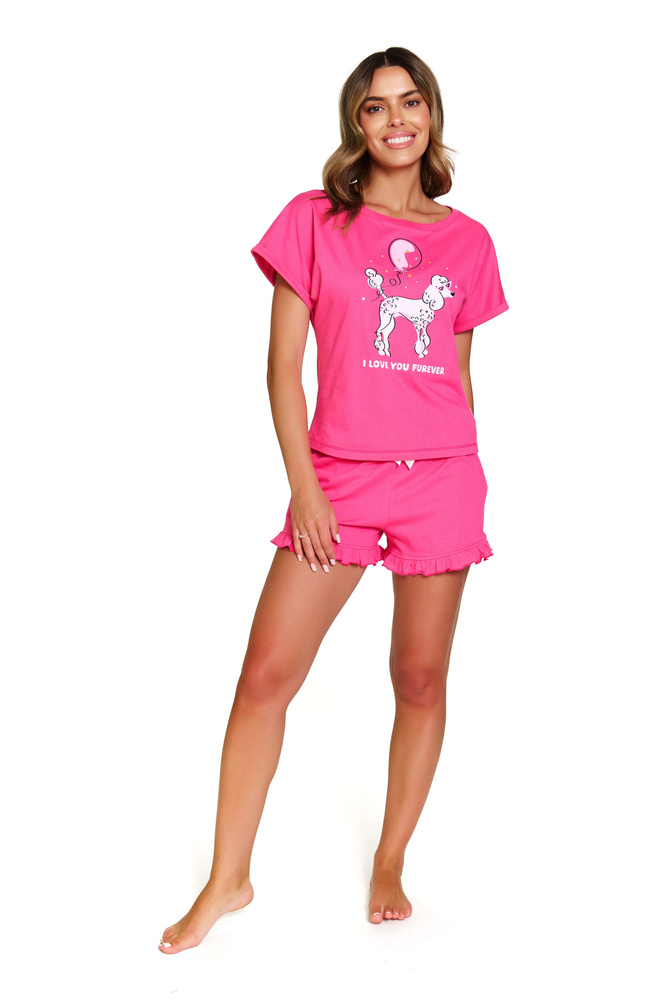 Doctor Nap 7357 to piżama damska, która łączy wygodę z dziewczęcym urokiem. Wykonana z wysokiej jakości, miękkiej bawełny, idealnie sprawdzi się na letnie noce i poranki. Koszulka z krótkim rękawem ozdobiona została uroczym nadrukiem z pudlem i napisem „I love you furever”. Krótkie spodenki z falbanką i satynową kokardką dodają lekkości i wdzięku. To idealna piżama dla kobiet, które lubią bawić się modą – także w domowym zaciszu.