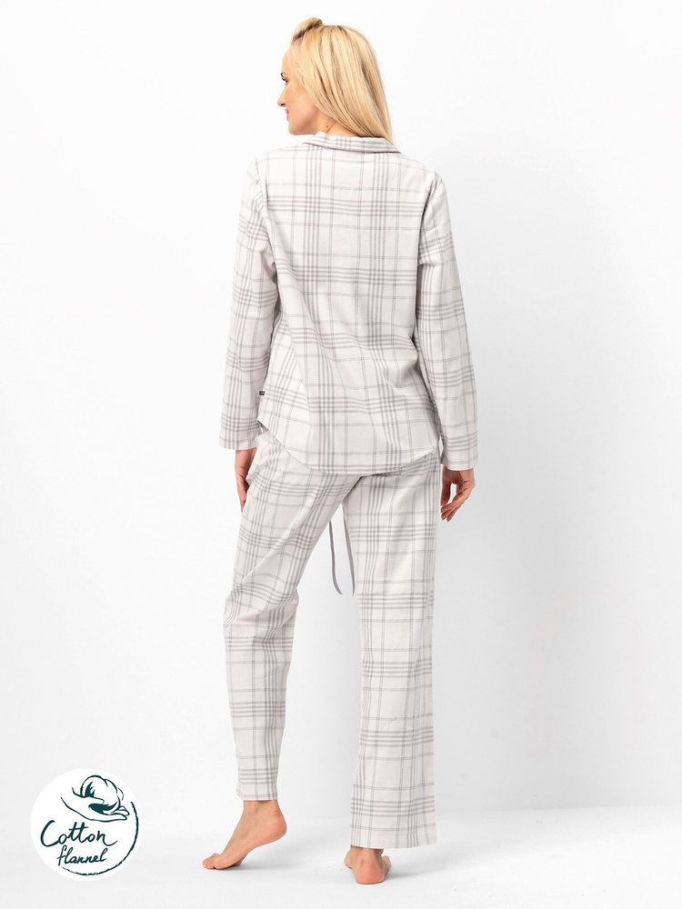 - Damska piżama Key LNS 401 z bawełny flanelowej. Miękka i ciepła, koszula zapinana na guziki, długie spodnie – idealna na chłodne noce.