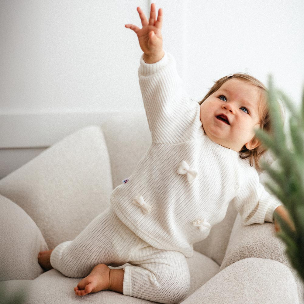 - Sweterek niemowlęcy Eevi w kolorze ecru. Z uroczymi kokardkami z przodu i rękawami zakończonymi ściągaczem. Miękki, wygodny i idealny na chłodniejsze dni.