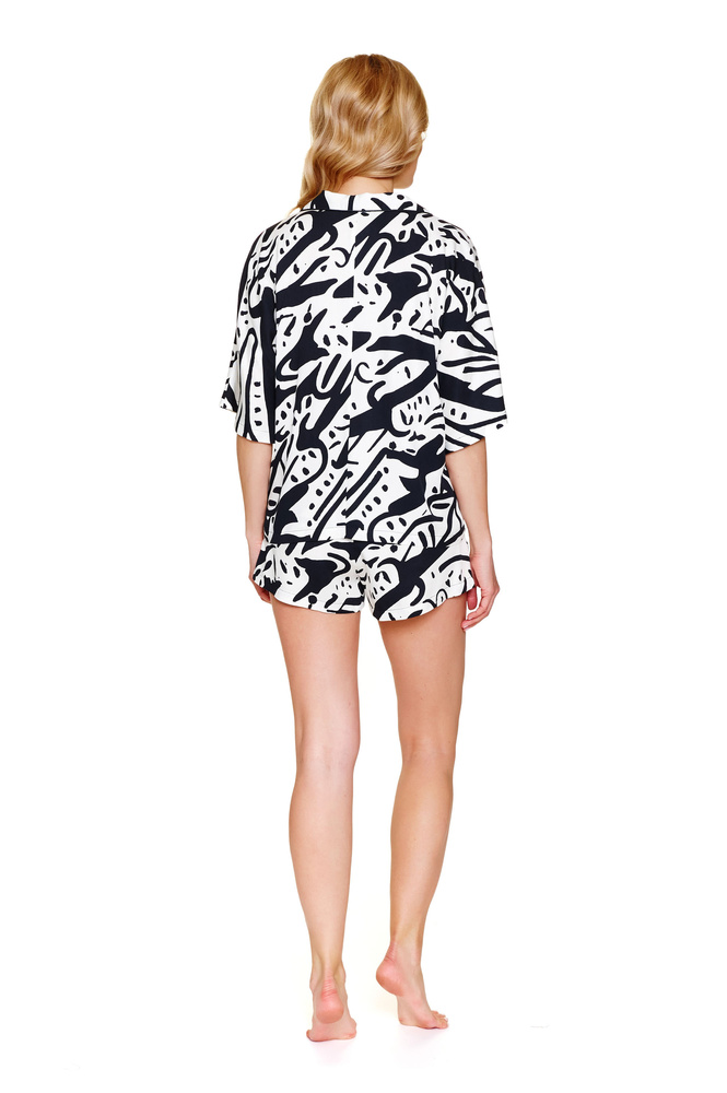 Piżama damska Doctor Nap 7310 z kolekcji La Palma to idealne połączenie wygody i nowoczesnego designu. Komplet składa się z przewiewnej koszuli zapinanej na guziki i krótkich spodenek. Geometryczny, czarno-biały wzór nadaje całości unikalnego charakteru.