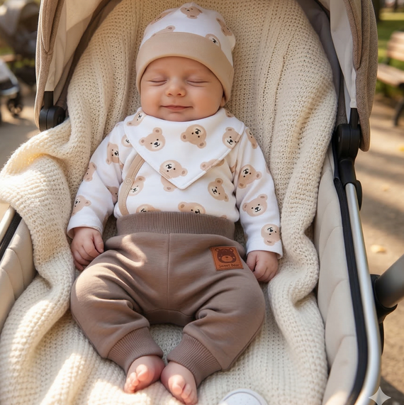 - Nini Sweet Bears – komplet niemowlęcy z miękkiej bawełny organicznej, wygodny i bezpieczny dla delikatnej skóry dziecka