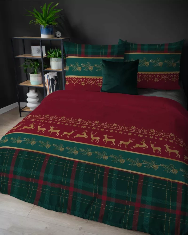 5620 B Magia Świąt Pościel flanelowa świąteczna Detexpol czerwona z reniferami i kratą– bawełna 100%, 160 g/m², zamek, OEKO-TEX®