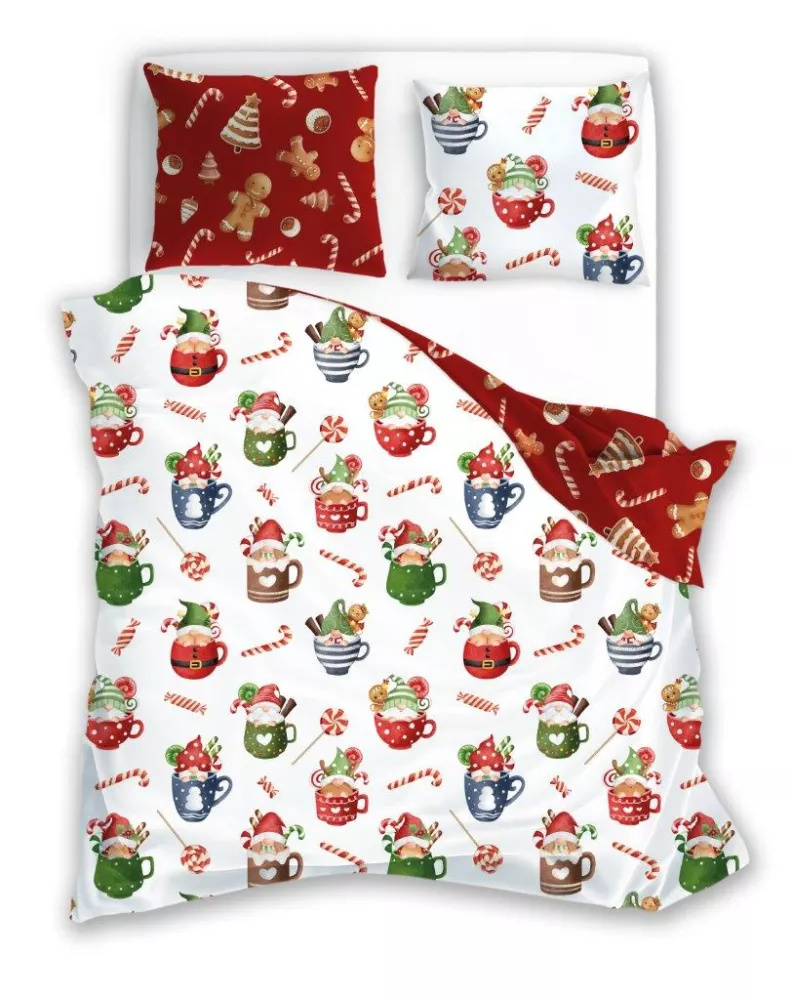 Scandic 062 Pościel świąteczna Scandic Faro biała czerwona skrzaty kubki – dwustronna bawełna 100%, zamek