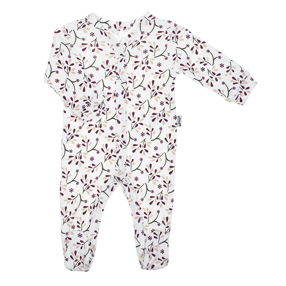 Wygodny pajacyk z długim rękawem dla dziewczynki. Uszyty z bawełny drukowanej z motywem roślinnym. Zastosowano materiały wysokiej jakości, bezpieczne dla skóry dziecka. Pajacyk ten to zdecydowanie must have każdego rodzica. Zapinany wzdłuż całego ubranka na wygodne bezniklowe napy, by ułatwić przewijanie dziecka. Polecany jako jeden z elementów pierwszej wyprawki maluszka.