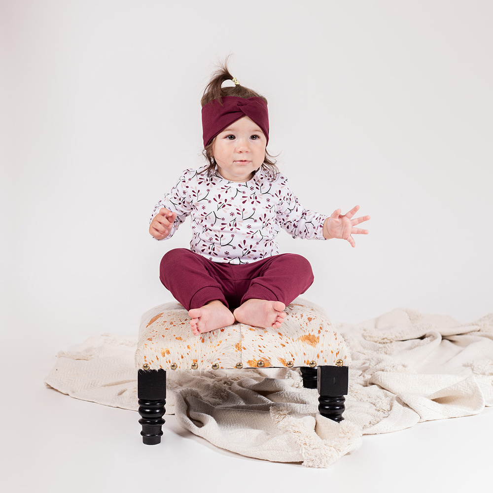 Opaska na głowę dla dziewczynki w kolorze burgundowym. Wykonana z wysokiej jakości bawełny z elastanem. Materiał z certyfikatem bezpieczne dla skóry dziecka. Fason charakteryzuje modny krój. Odpowiednie szerokość ochroni główkę dziecka przed chłodem. Ozdobny przeplot na przodzie dodaje uroku. Z boku naszyta jest naszywka z eko skórki. Opaska nie tylko będzie dodatkiem do ubranek z kolekcji Alisa, ale również uzupełni nie jedną stylizację z garderoby dziecka.