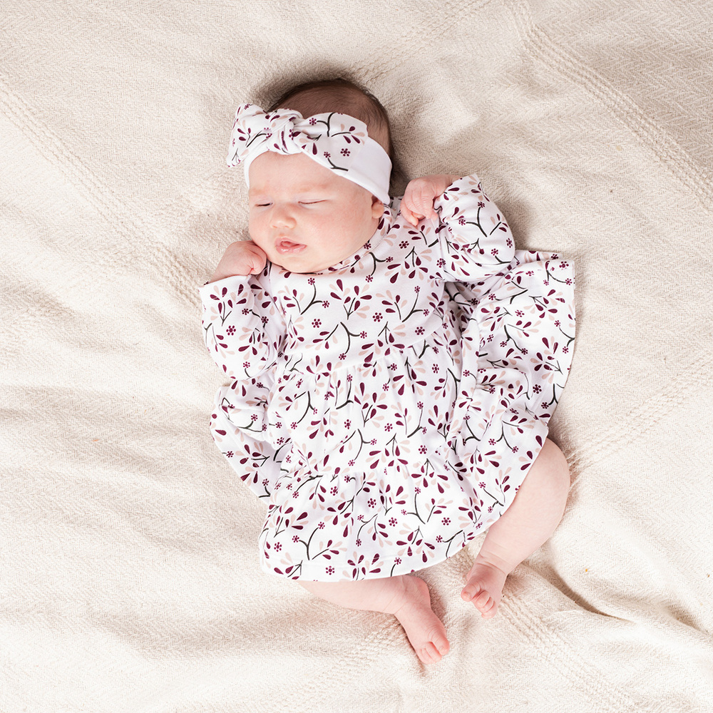 Stylowe sukienko-body dla dziewczynki z długim rękawem wykonane z kremowej bawełny drukowanej. Kontrastowy druk z motywem roślinnym dodaje uroku i charakteru. Materiał posiada certyfikat Oeko-Tex Standard 100 Tekstylia godne zaufania. Zapinane na bezniklowe napy na ramieniu oraz w dole. Ułatwi to znacznie przewijanie maluszka. Górna część produktu jest prosta, elegancka, natomiast dolna część składa się z dwóch zmarszczonych falban. Całość tworzy produkt wyjątkowy, polecany na różne uroczystości.