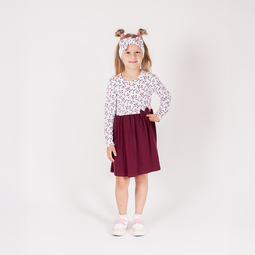 Sukienka z długim rękawem dla dziewczynki, wykonana z 100% bawełny bezpiecznej dla skóry dziecka. Góra produktu elegancka, prosta uszyta z materiału drukowanego. Piękny, kontrastowy druk z motywem roślinnym dodaje charakteru. Dolna część zmarszczona do linii karczka, tworzy spódniczkę w kolorze burgundowym. Na przodzie naszyto ozdobną kokardkę. W fasonie tym zastosowano zapięcie typu łezka, zapinane na bezniklowego napa. Sukienka polecana na różnego rodzaju okazje i uroczystości.