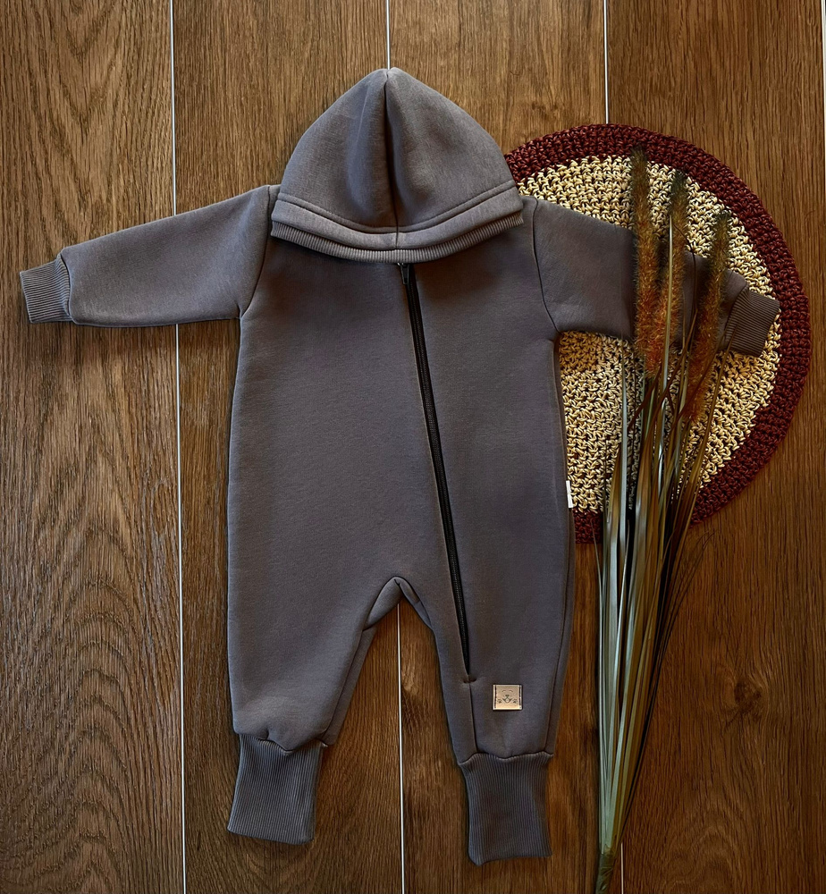 Delikatny, czekoladowy odcień nadaje kombinezonowi ciepłego, naturalnego charakteru i jest odpowiedni zarówno dla chłopca, jak i dziewczynki.