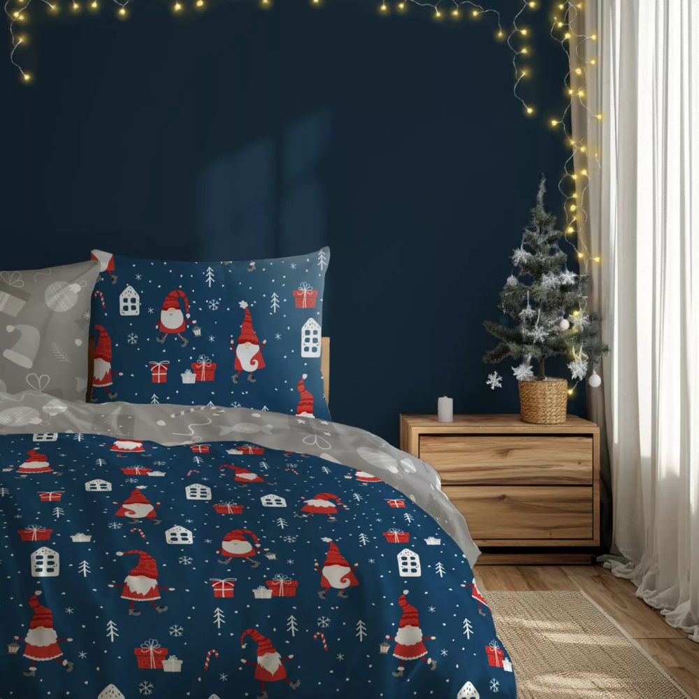 Scandic 081 Pościel świąteczna Scandic Faro granatowo-szara ze skrzatami– dwustronna bawełna 100%, zamek