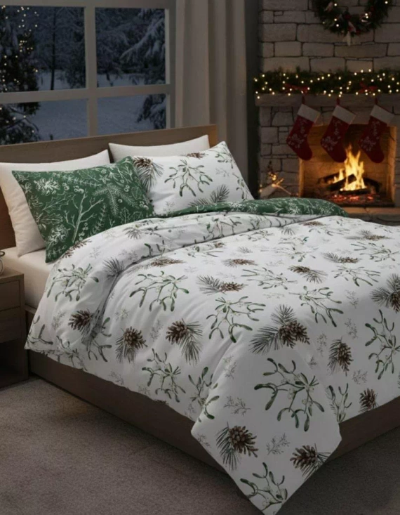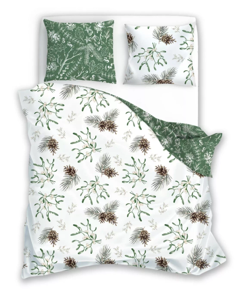 Scandic 083 Pościel świąteczna Scandic Faro biała i zielona z szyszkami- dwustronna bawełna 100%, zamek