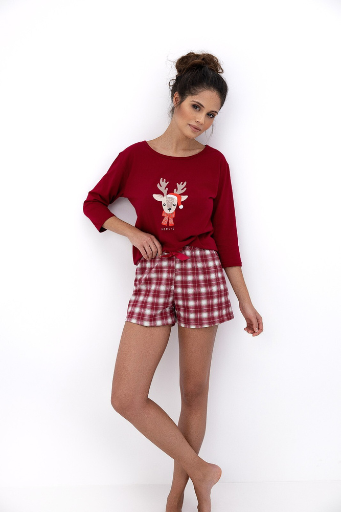 - Komfortowa piżama Elia Sensis wykonana w 100% z miękkiej, oddychającej bawełny. Zestaw składa się z koszulki z rękawem 3/4 z uroczym, świątecznym nadrukiem oraz szortów w kratkę z satynową kokardką.