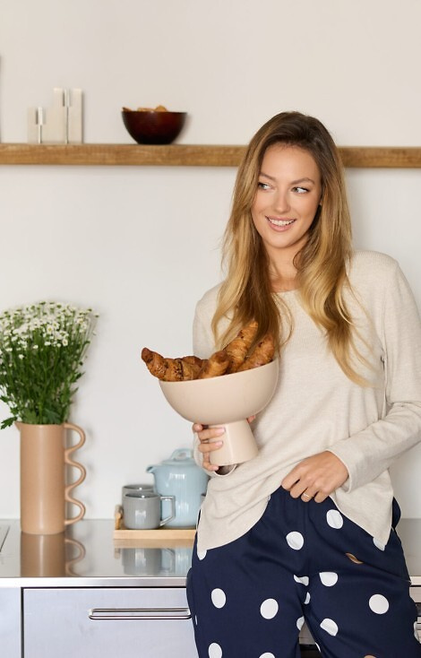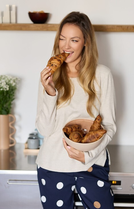 Do zestawu dołączone są długie spodnie z wiskozowej tkaniny, ozdobione uroczym printem w grochy.