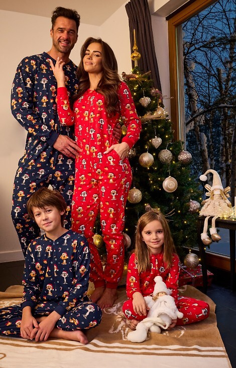 - Świąteczny kombinezon damski Cornette Dog 3 w kolorze czerwonym. Wykonany z miękkiej bawełny, z zamkiem, kieszeniami i ściągaczami.