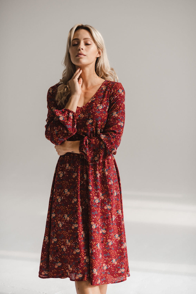 - Elegancka sukienka ciążowa i do karmienia Lovely Dress Midi w bordowym kolorze z kwiatowym printem. Komfortowa, kobieca i funkcjonalna – idealna na wyjątkowe okazje i na co dzień.